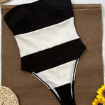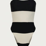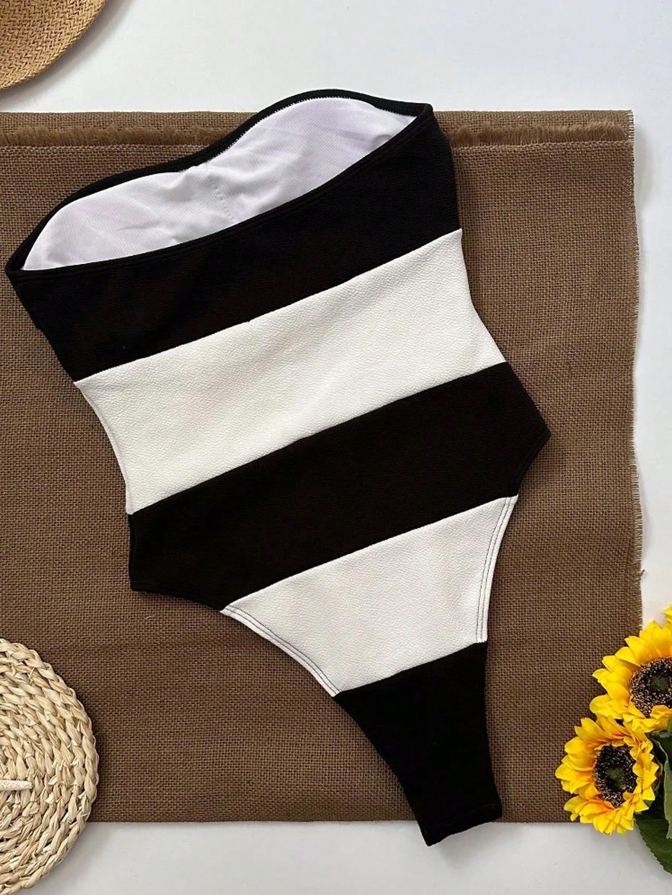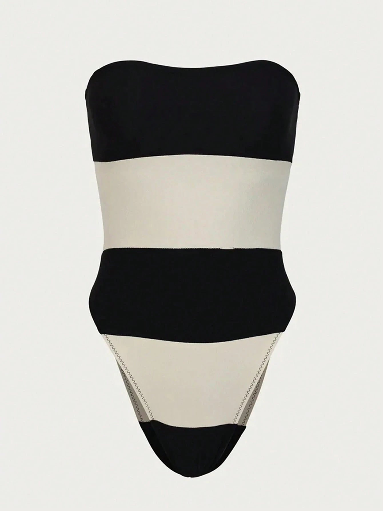 Minimalismus trifft auf moderne Raffinesse: Dieser schulterfreie Einteiler mit breiten Kontraststreifen setzt deine Figur perfekt in Szene. Der hohe Beinausschnitt verlängert optisch die Silhouette, während das trägerlose Design für ein cleanes, luxuriöses Finish sorgt. Ideal für stilbewusste Sonnenanbeterinnen, die am Pool oder Strand ein echtes Fashion-Statement setzen wollen.