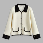 Verleihen Sie Ihrem Stil mit dieser schicken weißen Cardiganjacke einen Hauch von Eleganz. Sie besticht durch den raffinierten schwarzen Kontrastbesatz, einen klassischen Kragen und stilvolle Knopfdetails. Mit zwei Fronttaschen und modischen Manschetten ist dieses vielseitige Stück die perfekte Wahl für sowohl legere als auch formelle Looks und ein unverzichtbares Must-have für alle Jahreszeiten.