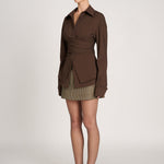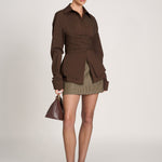 Diese Oversize-Bluse in sattem Braun kombiniert klassische Eleganz mit moderner Schnittführung. Der strukturierte Baumwollstoff, die langen Manschetten und die stilvolle Taillenraffung verleihen dem Modell eine edle Silhouette mit architektonischem Touch. Das Highlight ist das doppellagige Drapierband auf Taillenhöhe, das für einen femininen Kontrast zur weiten Passform sorgt.
