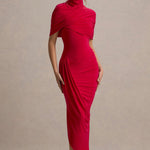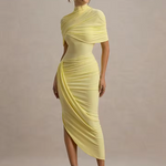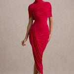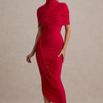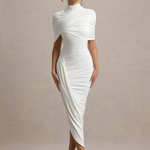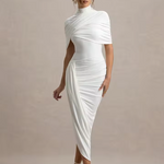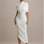 Dieses raffinierte Midikleid vereint klassische Eleganz mit moderner Extravaganz. Die drapierte Verarbeitung betont kunstvoll deine Silhouette, während der hohe Kragen und das capeartige Oberteil für einen dramatischen Effekt sorgen – ganz ohne übertrieben zu wirken. Ideal für Galaabende, formelle Empfänge oder ein stilvolles Dinner.