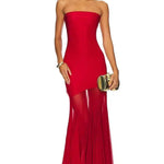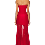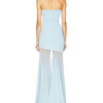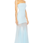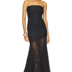 Dieses schulterfreie Maxikleid verbindet moderne Leichtigkeit mit sinnlicher Eleganz. Der enganliegende, minimalistische obere Teil geht fließend in einen transparenten Tüllrock über, der für Bewegung, Luftigkeit und ein Hauch Dramatik sorgt. Der figurbetonte Schnitt betont die Silhouette, während das trägerlose Design einen eleganten, freien Oberkörper ermöglicht.