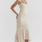 Dieses atemberaubende, schulterfreie Abendkleid ist die perfekte Wahl für elegante Auftritte bei Hochzeiten, Gala-Events oder romantischen Abenden. Das Kleid vereint feminine Eleganz mit einem Hauch Sinnlichkeit und ist aus hochwertiger Spitze gefertigt, die sich angenehm an die Haut anschmiegt. Die taillierte Silhouette betont die weiblichen Kurven, während der asymmetrische Saum dem Design eine moderne Raffinesse verleiht. Die feinen Drapierungen an der Taille sorgen für eine schmeichelhafte Form und setzen stilvolle Akzente. Das Kleid wird ohne Träger getragen, wodurch Schultern und Dekolleté wunderschön in Szene gesetzt werden. Es ist ideal für Frauen, die ein Statement setzen und sich in ihrer Haut rundum wohlfühlen möchten.