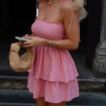 Fügen Sie Ihrer Garderobe einen Hauch von Sommerfrische hinzu mit diesem Wibke Charmantes rosa-weiß karierten Sommerkleid. Mit einem elastischen Smok-Oberteil für eine perfekte Passform und verstellbaren Spaghettiträgern für optimalen Komfort vereint dieses Kleid mühelos Stil und Funktionalität. Der doppellagige Rüschenrock verleiht eine verspielte Note, während das leichte Material es ideal für warme Tage macht. Perfekt für Strandtage, Gartenpartys oder entspannte Zusammenkünfte.