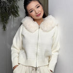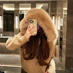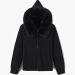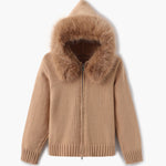 Damen Strickjacke Grau mit Kapuze und Kunstpelz – Warme Winterjacke