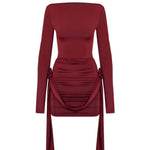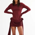Dieses stilvolle Mini-Kleid kombiniert moderne Eleganz mit einem Hauch von Verspieltheit. Die seitlichen Raffungen mit Bindedetails sorgen für einen individuellen Look und schmeicheln der Figur. Der enganliegende Schnitt und die langen Ärmel machen dieses Kleid zu einer perfekten Wahl für besondere Anlässe oder trendige Abendveranstaltungen.