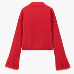 Dieser stilvolle Strick-Cardigan verbindet klassische Eleganz mit modernen Akzenten. Die schlichte Knopfleiste und die klare Silhouette machen ihn vielseitig kombinierbar, während die federverzierten Ärmel einen Hauch von Luxus und Verspieltheit hinzufügen. Perfekt für besondere Anlässe oder um Ihrem Alltagslook eine glamouröse Note zu verleihen.