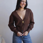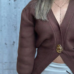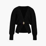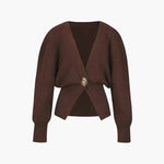 Aktualisieren Sie Ihre Garderobe mit dieser Strickjacke von Norina, die sich mühelos mit einem eleganten cremefarbenen Minirock kombinieren lässt. Dieses trendige Ensemble ist perfekt für Herbst und Winter und bietet sowohl Wärme als auch Eleganz. Die Strickjacke mit tiefem V-Ausschnitt verfügt über einen einzigartigen Frontverschluss mit goldenem Akzent, der für einen raffinierten und dennoch gemütlichen Look sorgt.