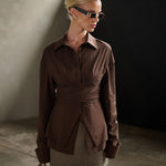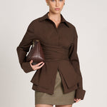 Diese Oversize-Bluse in sattem Braun kombiniert klassische Eleganz mit moderner Schnittführung. Der strukturierte Baumwollstoff, die langen Manschetten und die stilvolle Taillenraffung verleihen dem Modell eine edle Silhouette mit architektonischem Touch. Das Highlight ist das doppellagige Drapierband auf Taillenhöhe, das für einen femininen Kontrast zur weiten Passform sorgt.
