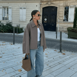Diese cropped Jacke mit klassischer Knopfleiste und breiter Kragenform ist ein Statement in zurückhaltender Eleganz. Sie lässt sich hervorragend mit Jeans, High-Waist-Hosen oder Strickteilen kombinieren – ob für einen City-Walk, Office Day oder Café-Besuch.
