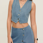 Der Diana Zweiteiler bringt den klassischen Denim-Stil auf ein neues Level. Die figurbetonte Jeans-Weste mit Knopfverschluss verleiht dem Outfit eine trendige Vintage-Note, während der elegante Maxirock mit Knopfleiste und hohem Schlitz für eine feminine und moderne Silhouette sorgt. Perfekt für lässige Tagesoutfits, City-Trips oder coole Streetstyle-Looks.