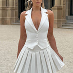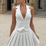Das Elegantes Faltenrock-Set mit Blazer-Weste kombiniert raffinierte Eleganz mit modernem Chic und ist die perfekte Wahl für stilbewusste Frauen. Die ärmellose Blazer-Weste mit tiefem Reverskragen und Knopfverschluss sorgt für eine edle, strukturierte Silhouette, die sowohl elegant als auch trendig wirkt. Der plissierte Minirock ergänzt den Look mit einer verspielten, femininen Note und verleiht dem Outfit eine zeitlose Ausstrahlung.
