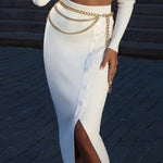 - Moderne Silhouette: Das Set besteht aus einem Crop Top und einem langen, geteilten Kleid, das eine wunderschöne, feminine Figur zaubert.