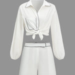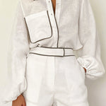 Das Lina Zweiteiler-Set besticht durch seine schlichte Eleganz und stilvollen Kontrastdetails. Die leichte Bluse mit aufgesetzter Tasche und feinen Paspeln sorgt für einen edlen Look, während die passenden Shorts mit Taillengürtel eine feminine Silhouette kreieren. Perfekt für warme Tage oder schicke Freizeit-Outfits – dieses Set vereint Komfort und Mode in einem stilvollen Design.