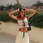 Das Sofia Zweiteilige Boho-Set ist die perfekte Wahl für einen luftigen und femininen Sommerlook. Das geraffte Crop-Top mit verspielten Rüschen und Schnürung betont deine Taille, während der fließende Maxi-Rock mit elastischem Bund für maximalen Komfort sorgt. Die kontrastierenden Details verleihen dem Set eine stilvolle Note, ideal für Strandtage, Urlaub oder entspannte Sommerabende.