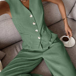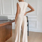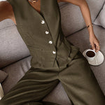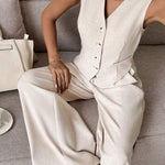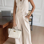 Dieses zweiteilige Ensemble besteht aus einer strukturierten, ärmellosen Weste und einer weit geschnittenen Hose – perfekt für warme Tage, an denen du trotzdem stilvoll und angezogen wirken willst. Der minimalistische Look trifft auf smarte Details wie eine taillierte Knopfleiste und praktische Seitentaschen.