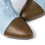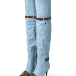 Die Chloe Denim Boots bringen ikonischen Denim-Charme in Ihre Schuhsammlung. Das knielange Design aus hellblauem Jeansstoff kombiniert mit eleganten braunen Kontrastdetails und einem schmalen Absatz macht diesen Stiefel zum perfekten It-Piece für Fashion-Liebhaberinnen. Ob lässig mit Oversized-Hemd oder chic mit Midikleid – Chloe sorgt für den perfekten Stilbruch und verleiht jedem Look das gewisse Etwas.