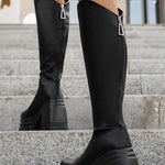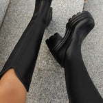 Diese schwarzen kniehohen Stiefel sind die perfekte Kombination aus Stil und Komfort. Mit einer Fußlänge von 24,5 Zoll und einer Absatzhöhe von 1,2 Zoll bieten sie eine perfekte Passform und angenehmen Tragekomfort. Die robuste Plateausohle sorgt für Stabilität und verleiht einen modernen Look.