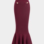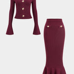 Das Atasha Zweiteiler-Set ist die perfekte Kombination aus femininer Eleganz und modernem Chic. Das enganliegende Strick-Top mit breitem Kragen und stilvollen goldenen Knöpfen verleiht dem Outfit eine edle Note. Der figurbetonte Midirock mit ausgestelltem Volant-Saum sorgt für einen eleganten und schwungvollen Look.