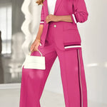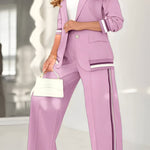Das Set besteht aus einem taillierten Blazer mit feinen weißen Details an den Ärmeln und einer High-Waist-Hose mit weitem Bein, die eine schmeichelhafte Silhouette zaubert. Der leichte, atmungsaktive Stoff macht dieses Set zum perfekten Begleiter für Frühling und Sommer.