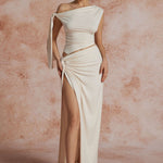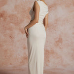 Das Eveline Zweiteiler-Set vereint moderne Eleganz mit femininer Raffinesse. Das asymmetrische One-Shoulder-Top mit Drapierung sorgt für eine stilvolle Silhouette, während der hochgeschnittene Wickelrock mit Knoten-Detail die Taille betont und eine schmeichelhafte Passform bietet. Perfekt für besondere Anlässe, elegante Abende oder stilvolle Sommer-Looks.