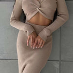 Das Jessica Zweiteiler-Set vereint schlichte Eleganz mit raffinierten Details. Das langärmelige Twist-Top betont das Dekolleté, während der figurbetonte Rock mit hohem Schlitz eine verführerische Silhouette schafft. Der weiche, gerippte Stoff sorgt für optimalen Tragekomfort und eine schmeichelhafte Passform. Dieses Set ist perfekt für stilbewusste Frauen, die Komfort und Chic mühelos kombinieren möchten.