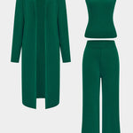 Das Luanne Dreiteilige Set vereint zeitlose Eleganz mit modernem Chic. Dieses stilvolle Ensemble besteht aus einem figurbetonten Rollkragen-Top, einer hochgeschnittenen, weit geschnittenen Hose und einem langen, fließenden Cardigan – gefertigt aus einem luxuriös weichen, gerippten Strickstoff. Die schmeichelhafte Silhouette bietet höchsten Tragekomfort und eignet sich perfekt für jede Gelegenheit, ob im Alltag oder bei besonderen Anlässen.