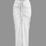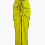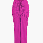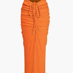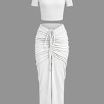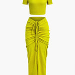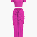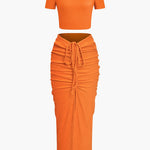 Das Maya Set kombiniert einen klassischen Rundhals-Crop-Top mit einem eleganten, gerafften Rock für einen trendigen und femininen Look. Der geraffte Bund mit Kordelzug betont die Taille und sorgt für eine schmeichelhafte Passform. Perfekt für Sommerpartys, City-Trips oder entspannte Abende.