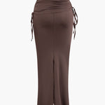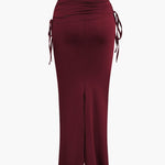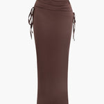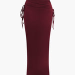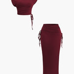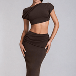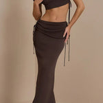 Das Melody Zweiteiler-Set vereint moderne Raffinesse mit einer figurbetonten Silhouette. Das One-Shoulder Crop-Top mit asymmetrischem Design und seitlicher Raffung setzt stilvolle Akzente, während der lange, enganliegende Maxi-Rock mit seitlichen Kordeldetails die feminine Linie betont. Perfekt für besondere Anlässe, Abendveranstaltungen oder trendige Street-Style-Looks.