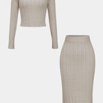 Das Thea Zweiteiler-Set vereint gemütlichen Strick mit stilvoller Eleganz. Der figurbetonte Rock mit feinem Zopfmuster betont die Silhouette, während das langärmlige Crop-Top mit Rundhalsausschnitt für eine moderne Note sorgt. Ob für entspannte Tage, schicke Casual-Looks oder besondere Anlässe – dieses Set bietet vielseitige Styling-Möglichkeiten mit zeitlosem Charme.