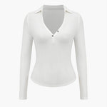 Dominique | Figurbetontes Langarm-Poloshirt mit tiefem V-Ausschnitt und eleganten Knopfdetails