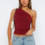 Verleihen Sie Ihrer Garderobe einen Hauch von Raffinesse und Eleganz mit unserem umwerfenden burgunderroten One-Shoulder-Rüschentop. Dieses vielseitige Kleidungsstück bietet eine schmeichelhafte Passform mit einem stilvollen Rüschendetail, das Ihre Kurven umschmeichelt und Ihre Silhouette akzentuiert. Egal, ob Sie zu einem legeren Ausflug, einem romantischen Date oder einem Wochenendausflug aufbrechen, dieses Oberteil ist die perfekte Wahl für alle Gelegenheiten.