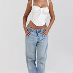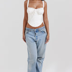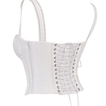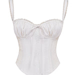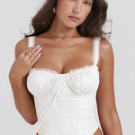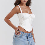 Zeitlose Eleganz: Weißes, geschnürtes Korsett-Top mit zarten Spitzenträgern und geraffter Brustpartie.