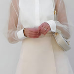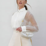 Diese edle Bluse mit transparenten Ärmeln ist die perfekte Kombination aus klassischem Design und moderner Raffinesse. Der strukturierte Kragen, die verdeckte Knopfleiste und die leicht durchscheinenden Puffärmel machen sie zu einem außergewöhnlichen Kleidungsstück für besondere Anlässe oder stilvolle Everyday-Looks.