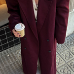 Beschreibung: Dieser lange Mantel aus hochwertigem Wollmix kombiniert klassische Eleganz mit einem modernen, oversized Schnitt. Mit seiner tiefen bordeauxroten Farbe ist er das perfekte Kleidungsstück, um an kühlen Tagen stilvoll und warm zu bleiben. Der zweireihige Verschluss und die breiten Reverskragen verleihen dem Mantel einen raffinierten Touch.