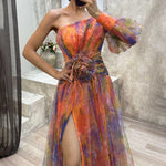 Asymmetrisches Abendkleid – One-Shoulder Maxikleid mit Blumenapplikation & Schlitz