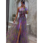 Dieses luxuriöse Abendkleid sorgt für einen Auftritt, der im Gedächtnis bleibt. Mit seinem asymmetrischen One-Shoulder-Design, der transparenten, fließenden Stofflage und der auffälligen Blumenapplikation mit Federn an der Taille kombiniert es Haute-Couture-Glamour mit femininer Eleganz. Der hohe Beinschlitz bringt subtile Sinnlichkeit in den Look und gibt dir das Gefühl, auf dem roten Teppich zu stehen – ganz gleich, wo du bist.